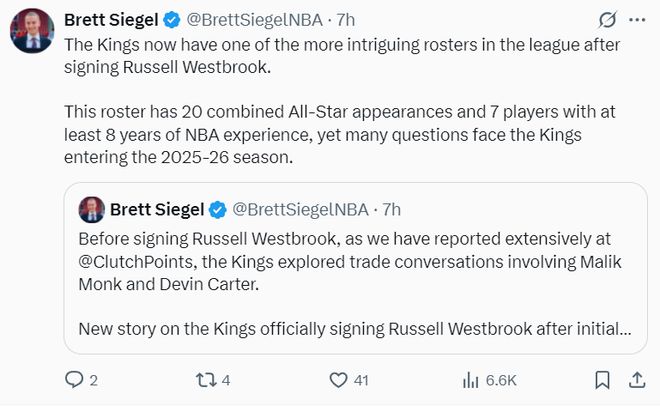 国王队短短几小时内1签1续后已经完美的凑齐了新赛季的阵容,美记Brett Siegel评论:在签下威少后,国王队已经拥有联盟最瞩目的阵容之一,队内的球员合计20次入选全明星,其中有7人至少拥有8年的NBA经验,但国王依旧面对诸多问题。